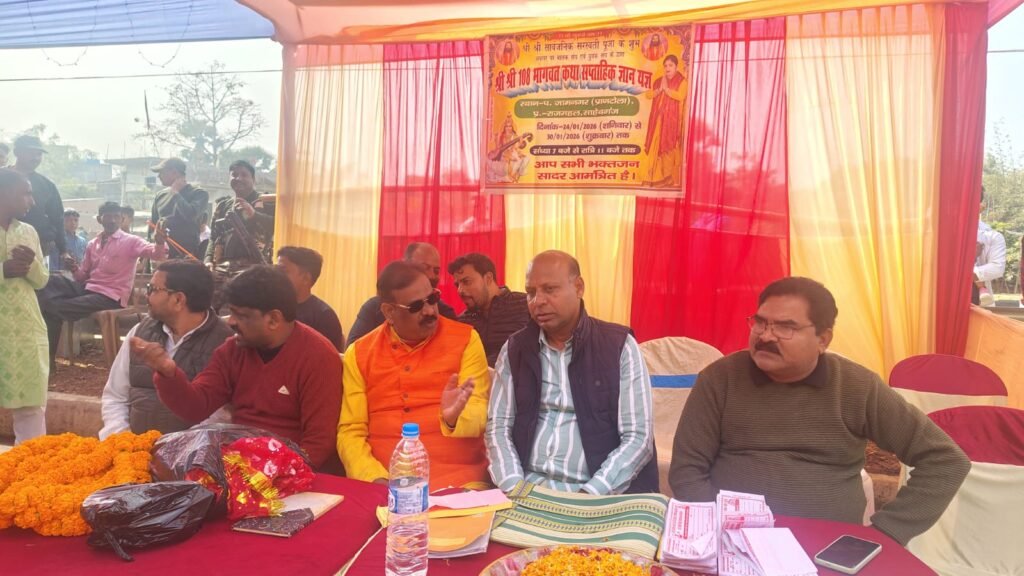 राजमहल साहिबगंज।राजमहल प्रखंड क्षेत्र के जामनगर प्रांतोला में सार्वजनिक सरस्वती पूजा के शुभ अवसर पर श्री श्री 108 भागवत कथा साप्ताहिक ज्ञान यज्ञ का भव्य आयोजन किया गया। इस धार्मिक आयोजन का संचालन बालक संघ एवं युवक संघ के संयुक्त तत्वावधान में किया जा रहा है।ज्ञान यज्ञ के शुभारंभ अवसर पर आयोजित कलश यात्रा का विधिवत उद्घाटन राजमहल विधायक मो. ताजुद्दीन उर्फ एमटी राजा एवं विधायक प्रतिनिधि मोहम्मद मारुफ गुड्डू ने संयुक्त रूप से फीता काटकर किया। आयोजन समिति के सदस्यों ने अतिथियों का माला एवं चुनरी भेंट कर गर्मजोशी से अभिनंदन किया।इस अवसर पर 501 कन्याओं ने पारंपरिक वेशभूषा में सिर पर कलश धारण कर भव्य कलश यात्रा निकाली। कलश यात्रा जामनगर सहित आसपास के ग्रामीण क्षेत्रों का भ्रमण करते हुए पूरे क्षेत्र में धार्मिक और भक्तिमय माहौल का सृजन करती दिखी।सभा को संबोधित करते हुए विधायक एमटी राजा ने कहा कि “समाज में भाईचारे के साथ सौहार्दपूर्ण वातावरण बना रहे, यही हम सबका उद्देश्य और संदेश है। ऐसे धार्मिक आयोजन आपसी एकता, शांति और सद्भाव को मजबूत करते हैं।”मौके पर झामुमो प्रखंड अध्यक्ष अनिसुर रहमान, एकरामुल शेख, अजय दास, नकुल मंडल, बिंदेश्वरी यादव सहित बड़ी संख्या में गणमान्य लोग, समिति सदस्य एवं श्रद्धालु उपस्थित थे।