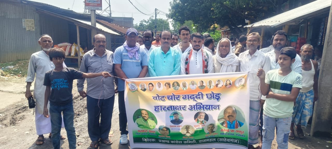 साहिबगंज, झारखंड – झारखंड प्रदेश कांग्रेस कमेटी के निर्देश पर राजमहल प्रखंड अंतर्गत लखीपुर पंचायत के मस्तानगढ़ में “वोट चोर, गद्दी छोड़” हस्ताक्षर अभियान की शुरुआत की गई। इस अभियान का नेतृत्व जिला अध्यक्ष एवं विधायक प्रतिनिधि बरकतुल्लाह खान ने किया, जबकि कार्यक्रम की अध्यक्षता प्रखंड अध्यक्ष देवेंद्र प्रसाद ठाकुर ने की।