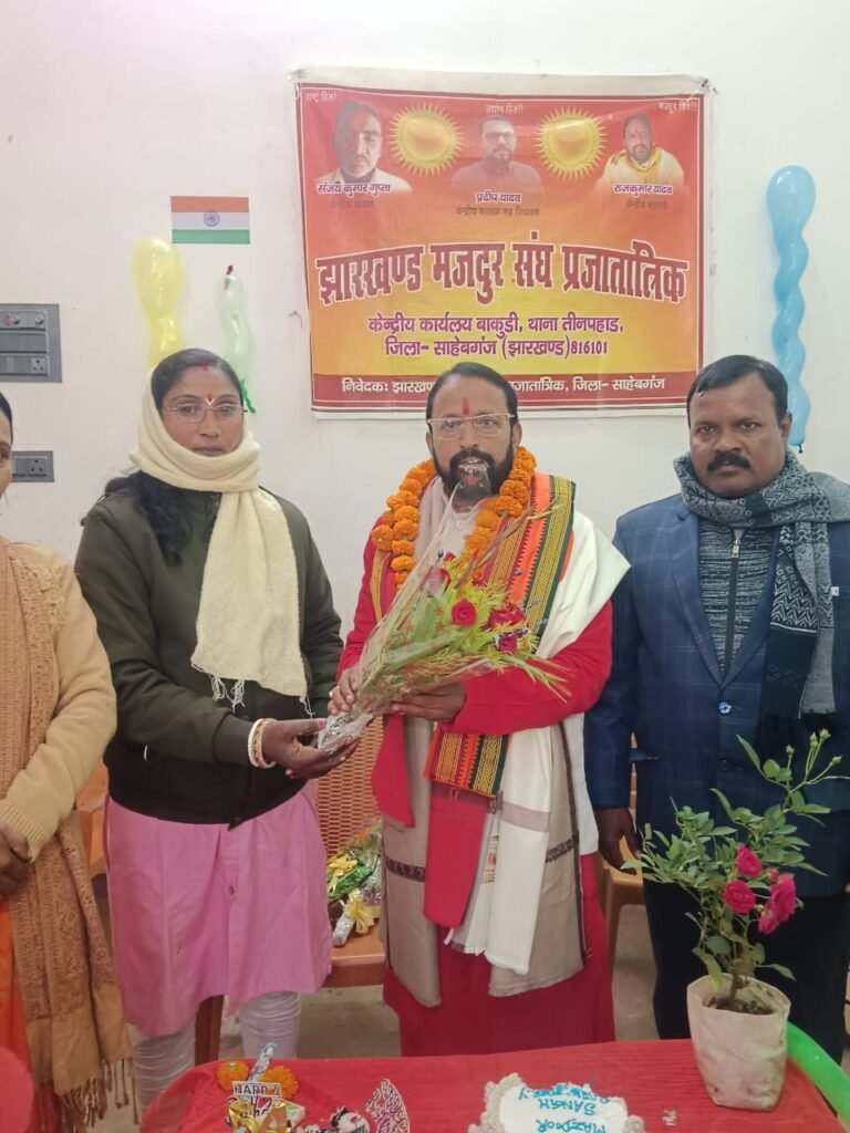 साहिबगंज।झारखंड मजदूर संघ (प्रजातांत्रिक) की जिला कमेटी की एक महत्वपूर्ण बैठक आज दिन के 12:00 बजे संघ के केंद्रीय कार्यालय, बाकुडी में सौहार्दपूर्ण वातावरण में संपन्न हुई। बैठक की अध्यक्षता जिला अध्यक्ष प्रीतम कुमार पीयूष ने की।बैठक में संघ के केंद्रीय महामंत्री राजकुमार यादव, केंद्र सहायक मंत्री गणेश ठाकुर तथा केंद्र उपाध्यक्ष फूल कुमारी देवी की गरिमामयी उपस्थिति रही, जिससे बैठक की महत्ता और भी बढ़ गई।बैठक के दौरान विगत 21 दिसंबर 2025 को बरहरवा में आयोजित झारखंड मजदूर संघ (प्रजातांत्रिक) के वार्षिक अधिवेशन की विस्तारपूर्वक समीक्षा की गई। सभी पदाधिकारियों एवं सदस्यों ने एकमत से कहा कि यह अधिवेशन पूर्णतः सफल रहा। अधिवेशन की सफलता का श्रेय संगठन के समर्पित पदाधिकारियों एवं कर्मठ सदस्यों को दिया गया।नए वर्ष के अवसर पर संगठनात्मक एकता, आपसी भाईचारे एवं समन्वय को और अधिक मजबूत करने के उद्देश्य से बैठक में यह सर्वसम्मति से निर्णय लिया गया कि आगामी 18 जनवरी को संघ के सभी सदस्य मिलकर मोती झरना पर्यटक स्थल में वन भोज (पिकनिक) का आयोजन करेंगे।बैठक के उपरांत संगठन के केंद्रीय महामंत्री राजकुमार यादव एवं केंद्र सहायक मंत्री गणेश ठाकुर के जन्मोत्सव के अवसर पर केक काटकर हर्षोल्लास के साथ समारोह का आयोजन किया गया। उपस्थित सभी सदस्यों ने उन्हें शुभकामनाएं देते हुए उनके दीर्घायु, स्वस्थ एवं सफल जीवन की कामना की।बैठक में प्रमुख रूप से मोहम्मद इमाम विश्वास, ब्रह्मदेव यादव, निखिल यादव, मोहम्मद जावेद अख्तर, अंसार खान, रोशन मुर्मू, मोहम्मद सिफाजुल विश्वास, मिथुन घोष, बाबूराम साहा बैठा, तिलकाई मुर्मू, इकरामुल अली, जया देवी, रेखा देवी सहित अन्य कई सदस्य उपस्थित रहे।बैठक का समापन संगठन को और अधिक मजबूत, सशक्त एवं मजदूर हितों के लिए संघर्षशील बनाने के संकल्प के साथ किया गया।