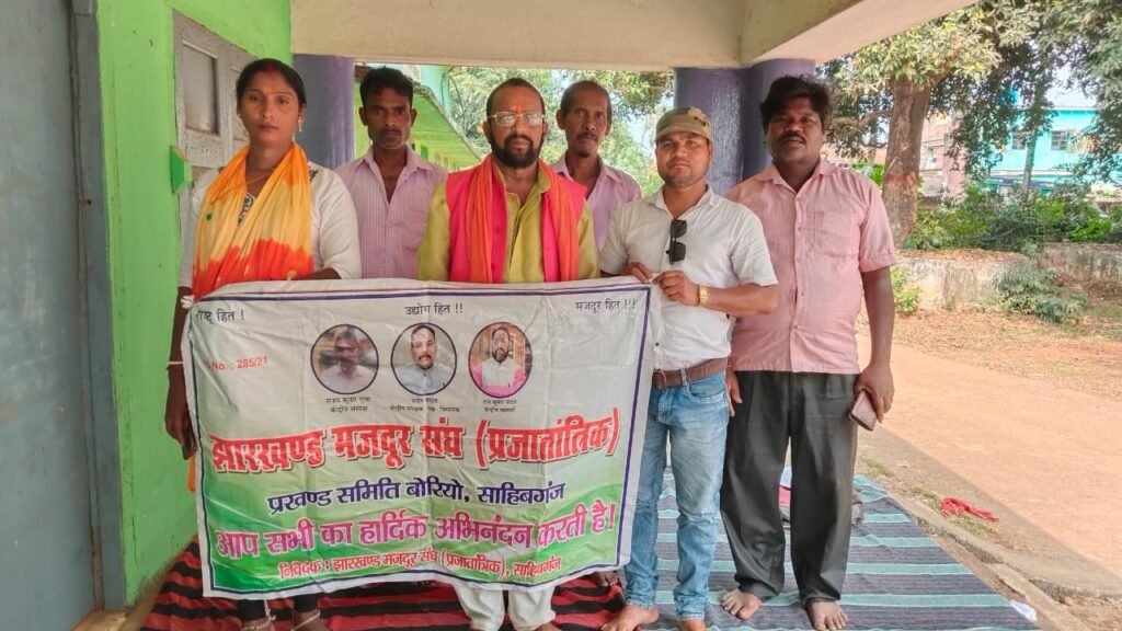 बोरियो साहिबगंज झारखंड मजदूर संघ (प्रजातांत्रिक) की प्रखंड स्तरीय बैठक रविवार को बोरियो के पुराने प्रखंड कार्यालय परिसर में हुई। बैठक की अध्यक्षता प्रखंड अध्यक्ष दिलीप हांसदा ने की। केंद्रीय महामंत्री राजकुमार यादव और केंद्रीय उपाध्यक्ष फूल कुमारी देवी मुख्य अतिथि के रूप में उपस्थित रहे।राजकुमार यादव ने अपने संबोधन में कहा कि संगठन की प्राथमिकता पंचायत स्तर तक मजबूती से विस्तार करना है, ताकि मजदूर वर्ग की आवाज़ सरकार तक प्रभावी रूप में पहुँच सके। उन्होंने मजदूरों के हितों की रक्षा और न्यूनतम मजदूरी निर्धारण के लिए संघ के संघर्ष पर भी प्रकाश डाला।बैठक में विचार-विमर्श के बाद सर्वसम्मति से निर्णय लिया गया कि 5 नवंबर 2025 को प्रखंड कार्यालय के समक्ष श्रमिक समस्याओं और न्यूनतम मजदूरी समिति गठन की मांग को लेकर एक दिवसीय धरना आयोजित किया जाएगा।इस अवसर पर अभिजीत रक्षित, गोपाल दास, चार्ल्स मुर्मू, श्रीकांत मुर्मू सहित बड़ी संख्या में सदस्य उपस्थित रहे। बैठक का माहौल उत्साहपूर्ण रहा और परिसर श्रमिक एकता के नारों से गूंज उठा।