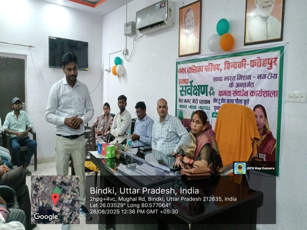 बिंदकी/फतेहपुर,।नगर पालिका में स्वच्छता संबंधी एक कार्यशाला का आयोजन किया गया जिसमें मुख्य अतिथि के रूप में मौजूद नगर पालिका की चेयरमैन राधा साहू ने कहा कि स्वच्छता से पर्यावरण ठीक रहता है और पर्यावरण ठीक रहने से सभी का शरीर स्वस्थ रहता है और स्वस्थ शरीर से ही व्यक्तित्व का विकास होता है। इस मौके पर लखनऊ से आई टीम ने सफाई नायक तथा सफाई कर्मचारियों को अलग-अलग कूड़ा किस प्रकार करेंगे इसकी विस्तार से जानकारी दिया और कहा कि कूड़े से बिजली तथा गैस भी बनती है इसके अलावा अन्य प्रयोग भी किए जाते हैं।
