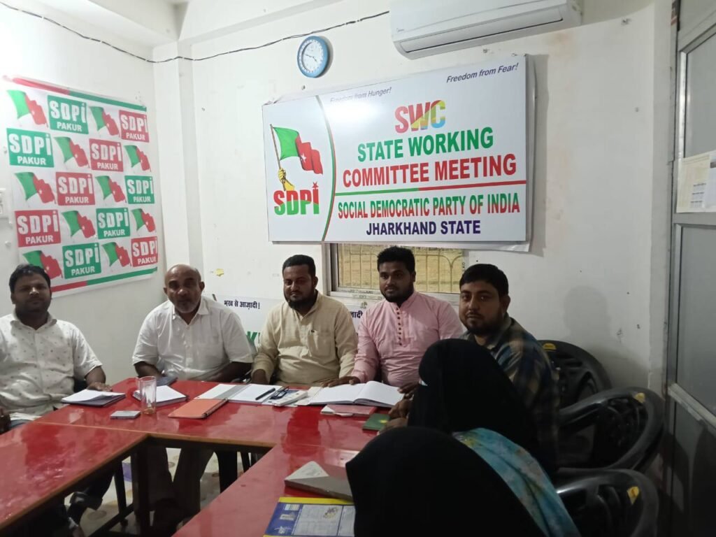 पाकुड़:-सोशल डेमोक्रेटिक पार्टी ऑफ इंडिया (एसडीपीआई) झारखंड प्रदेश कार्यकारिणी समिति की बैठक आज पाकुड़ स्थित एसडीपीआई क्षेत्रीय कार्यालय में सम्पन्न हुई। बैठक की अध्यक्षता प्रदेश अध्यक्ष मो० हंजेला शेख ने की।बैठक की शुरुआत विमेन इंडिया मूवमेंट (WIM) की प्रदेश अध्यक्ष वाजिदा खातून साहिबा के स्वागत भाषण से हुई। उन्होंने सभी अतिथियों एवं पदाधिकारियों का स्वागत करते हुए संगठन की भूमिका, महिला सशक्तिकरण और सामाजिक जागरूकता के महत्व पर विस्तार से चर्चा की।